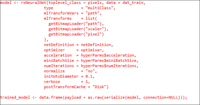 loads the new package that contains the new ML algorithms. In addition to DNN (the focus of this blog), there are five other powerful ML algorithms in this package – fast linear learner, fast tree, fast forest, one class SVM for anomaly detection, regularized logistic regression (with L1 and L2) and neural nets. So, with just 6-7 lines of R code, you can enable any app to get the intelligence from a DNN based model. All that the apps needs to do is connect to SQL Server. By the way, you can now very easily generate a stored procedure for R Code using the sqlrutils package.