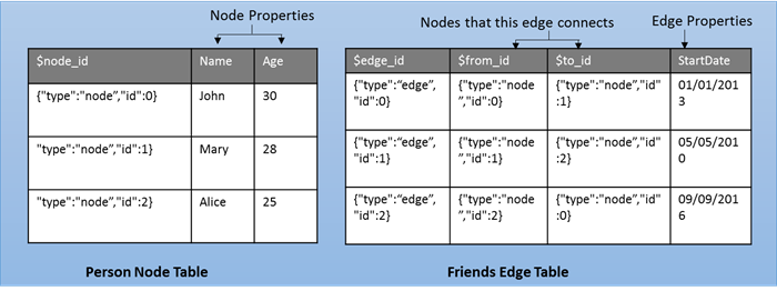 With the help of T-SQL extensions to DDL, users can create node or edge tables. Both nodes and edges can have properties associated to them. Users can model many-to-many relationships using edge tables. A single edge type can connect multiple type of nodes with each other, in contrast to foreign keys in relational tables. Figure 2 shows how a node and edge table are stored internally in the database. Since nodes and edges are stored as tables, most of the operations supported on tables are available on node or edge tables, too.