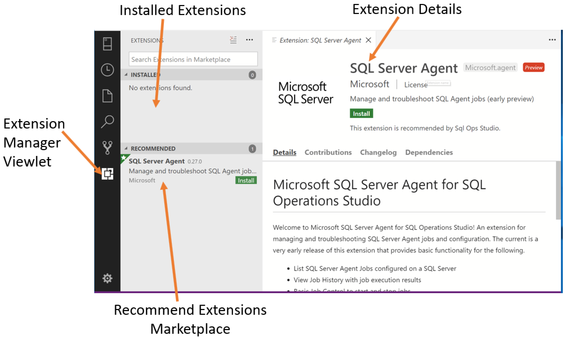 The Extension Manager makes it easy to discover and acquire additional SQL Operations Studio functionality. We’ve adopted the in-product extension management experience from Visual Studio Code. For users unfamiliar with this UI it consists of the following components.
