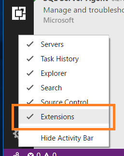 Note: If you don’t see the Extension Manager icon you may need to enable it by right-clicking on the left Activity Bar, and then click Extensions on the context menu.