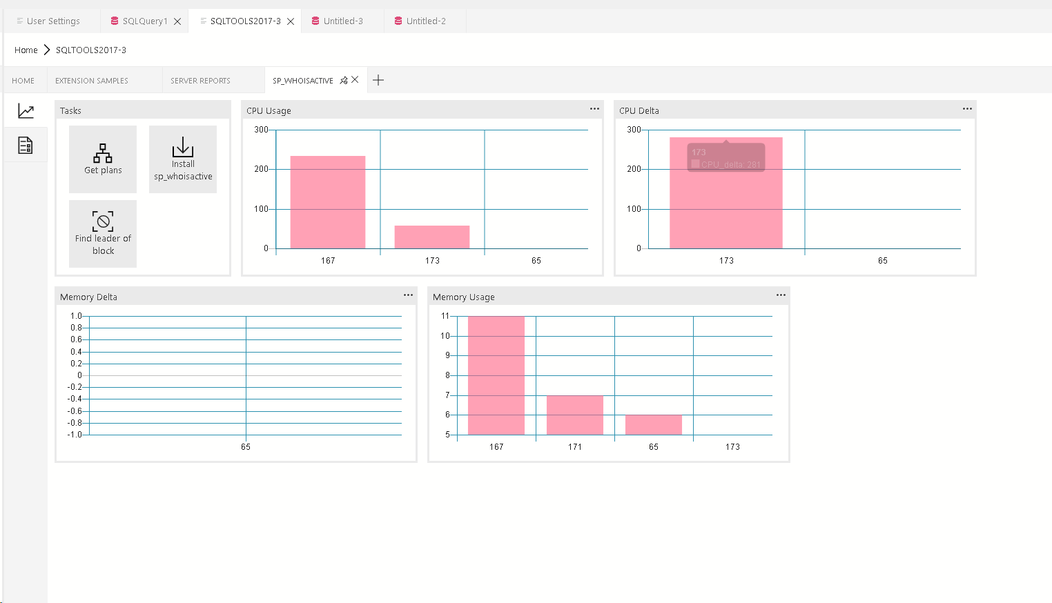 - Dashboard Insights extensions for sp_whoisactive from whoisactive.com and a Server Reports example