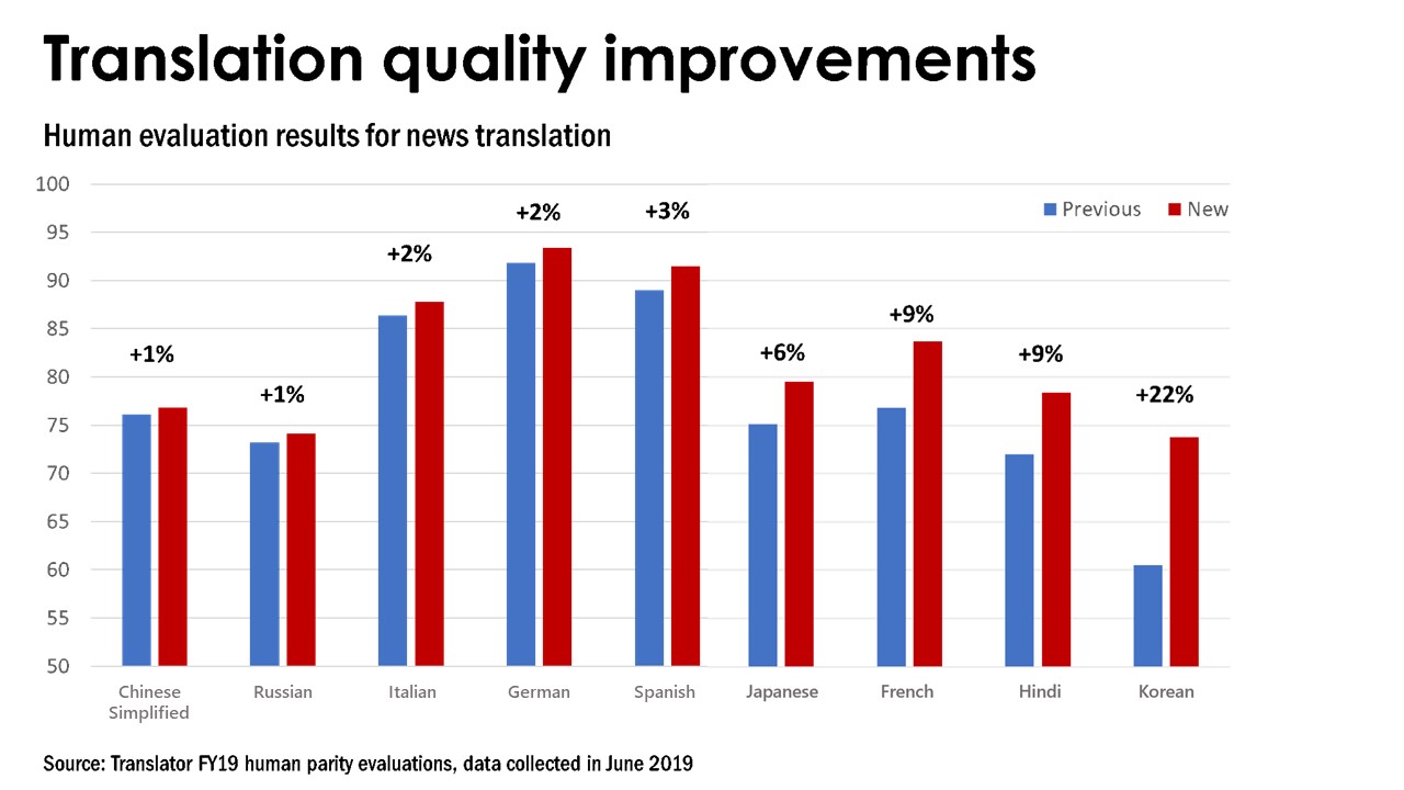 Täna oleme põnevil, et teatada kättesaadavusest meie uusima põlvkonna närvimasintõlke mudelid. Need mudelid sisaldavad enamiku meie uurimissüsteemi headust ja on nüüd vaikimisi saadaval Microsoft Translator API kasutamisel. Need uued mudelid on saadaval täna Hiina, saksa, prantsuse, hindi, Itaalia, Hispaania, Jaapani, Korea ja vene, alates ja inglise. Varsti tuleb veel keeli.