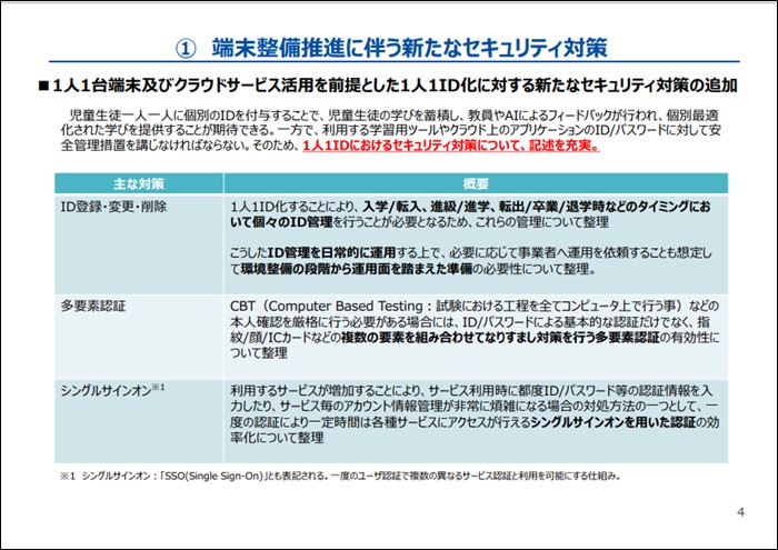 また、サービスごとの ID・パスワードの管理の運用効率化と負荷の最小化に加え、パスワードの使い回しによるセキュリティ リスクの低減などの観点から、学習系ツール・サービスへのシングル サインオン (SSO) の導入を行うことが望ましいと推奨しています。