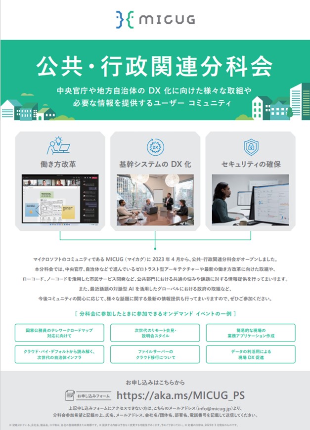「公共・行政関連分科会」は、国・自治体などの公共機関の職員皆さま、及び公共機関のDXを支援する IT 企業の皆さまを対象とした分科会です。加入後には、Microsoft Teams でのメンバー間・および・Microsoft 社員との交流も可能となります。 ぜひご参加をお申込みください(MICUG トップページ:https://micug.jp/)