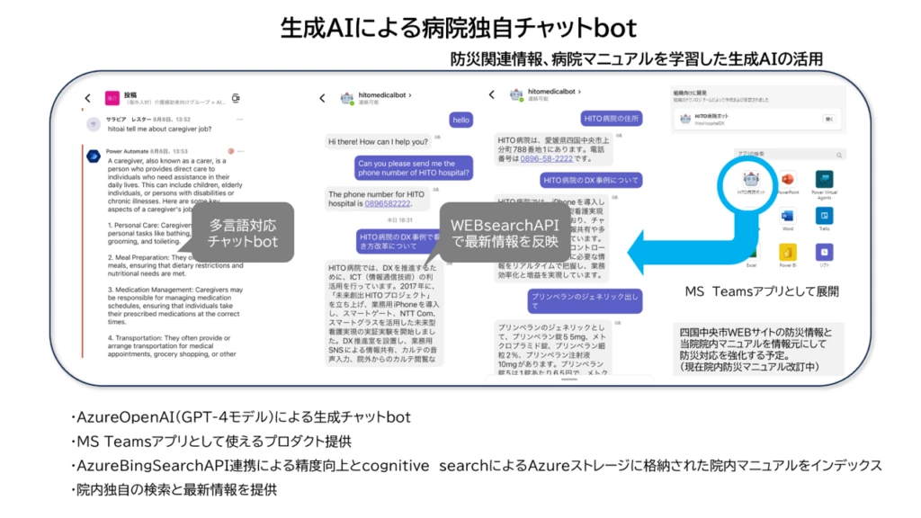 • Azure OpenAI service:AIと連携し、学ぶことで、全スタッフの能力がさらに活かされ、より能動的に対応できる病院となります。