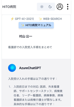 また、病院が導入時に検討するべき課題に正確性と説明責任の問題があり、出力結果の根拠を示すことが求められます。現在、院内マニュアルをAzure Cognitive Searchでインデックスし活用できるモードとBing Search APIによって最新の情報を取得し、活用できる2つのモードが生成AIアプリ上で提供可能となっています。AOAIは入力情報がAIのトレーニングに使用されないため、セキュリティが高く、機密性を確保できる点が病院での活用に有用で、AIモデル(GPT-4/text-embedding-ada-002など)を日本リージョン(Japan-East)で展開できること、サービス品質保証や使用量ベースの柔軟な価格設定など、生成AIを病院でも安心して安全に導入することができました。