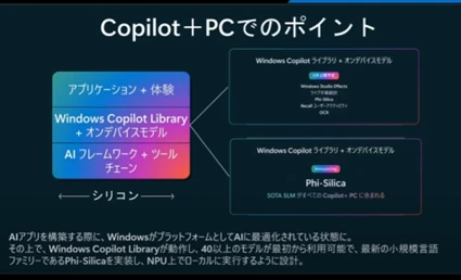 マイクロソフトは、生成AIをPCに組み込んで新たな体験を提供する次世代型PC「Copilot+PC」を発売した。オフラインで生成AIのタスクを処理できるようにするため、AIのタスク処理に特化したNPU(ニューラル・プロセッシング・ユニット)を採用。ローカル環境でも動くCopilotのAIモデルにはLLM(大規模言語モデル)を軽量型にして、計算負荷を減らしたSLM(小規模言語モデル)を搭載した。Copilotは、さまざまなAIモデルの搭載が可能。Copilot Studioを使えば、用途に応じてオリジナルのCopilotをローコードで開発できる。