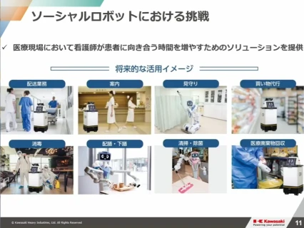 川崎重工業は、病院内で検体や薬剤を配送するロボットを開発した。加賀谷博昭氏は「産業用ロボットは柵の中のような空間で繰り返しの作業をするが、人の中で動くロボットは、人にぶつからずに動くことが求められる。究極には、人の道具を扱うことができるヒューマノイドがある」と語る。Co-Living(一緒に暮らす)ロボティクスに取り組むデンソーの成迫剛志氏は「生成AIによって、人との会話、周囲の状況から判断して、機械が自律行動できるようになる。ロボットに生成AIを導入するというより、「生成AIをリアルの世界に持ってくるという考え方で取り組みたい」と述べた。Microsoft Researchは「ロボティクスはAIを考えるうえで不可欠であり、エンボディドAI(物理的身体と環境の相互作用から学習するAI)に取り組んでいる」と鎌倉真音氏。