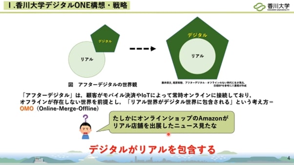 18 年間にわたって香川大学の事務職員を務めてきた武田氏が DX 担当になったのは 2021 年 4 月のことでした。当時はコロナ禍の真っ只中で、香川大学もまた DX の必要に迫られたそう。さらにはアフターコロナ(アフターデジタル)の世界を見据え、デジタルな世界がリアルな世界を包含する「OMO(Online-Merge-Offline)」の考えにもとづいた「香川大学デジタル ONE 構想」が打ち立てられました。