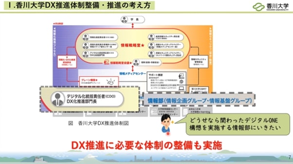 「デジタルネイティブの子ども達がデジタルとリアルを融合したものとしてごく自然に捉えるなかでは、彼らに教育を提供する我々もまた、それに応じて変わっていかなければなりません。そこで生まれたのが『香川大学デジタル ONE 構想』です。具体的には、学長の直下に『情報戦略室』を設置し、デジタル化統括責任者(CDO)も任命。DX には欠かせない、迅速な意思決定ができる体制へと変化させていきました」(武田氏)