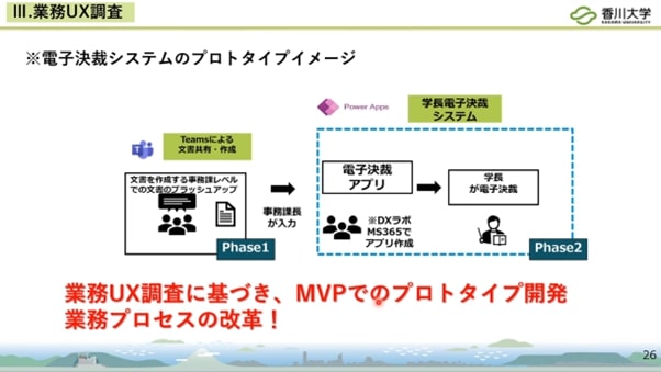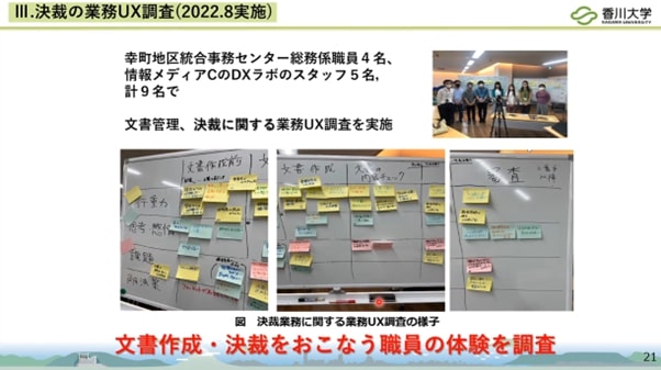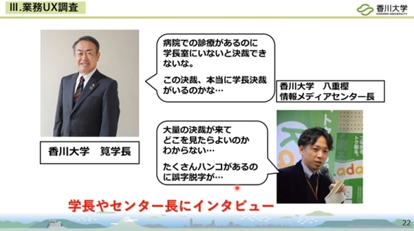 武田氏は香川大学のこれまでの取り組みをこう振り返ったうえで、実際の開発事例として、電子決裁を可能にする「学長電子決裁システム」を紹介しました。このシステムは同大学の幸町地区統合事務センターで業務に取り組む職員 4 名と DX ラボのスタッフ 5 名による業務 UX 調査から生まれたものです。