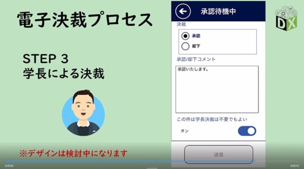 「このプロトタイプは DX ラボの学生がわずか 1 週間で作り上げたものです。起案者がアプリを介して決裁を申請すると、まずは理事と副学長のもとへ届き、内容の確認をしてもらえます。必要があればコメントを加え、次は学長のもとへ。ここで決裁が行われると、起案者のもとに通知が届く仕組みです。なおこの件でユニークなのは、『この件について学長決裁は不要』ボタンをつけたこと。これにより不要な決裁の案件自体を減らし、肥大した業務をスリム化する効果もねらいました」(武田氏)。