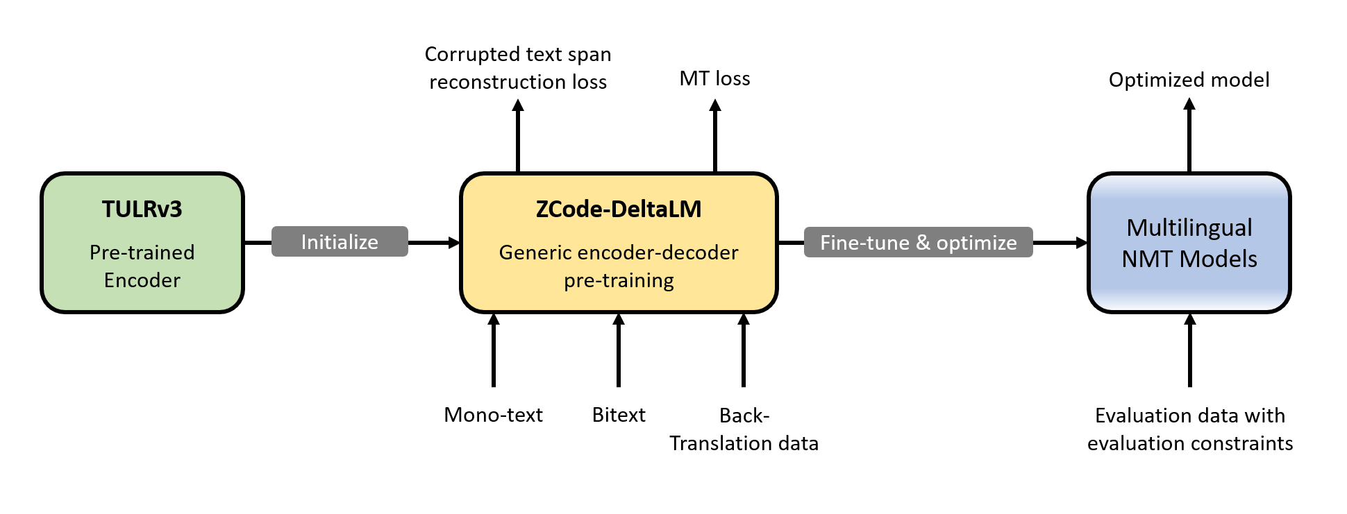 În această postare pe blog, să aruncăm o privire sub capotă la modelul câștigător Microsoft ZCode-DeltaLM. Punctul nostru de plecare a fost DeltaLM (DeltaLM: Pre-training encoder-decodor pentru generarea și traducerea limbilor străine prin augmentarea codificatoarelor multilingve precalificate), cea mai recentă din seria din ce în ce mai puternică de modele lingvistice precalificate multilingve masiv de la Microsoft.