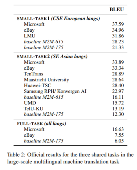 Figura 1: Rezultate oficiale (scoruri BLEU) privind sarcina completă și sarcina mică1 la sarcina comună wmt 2021 traducere multilingvă la scară largă