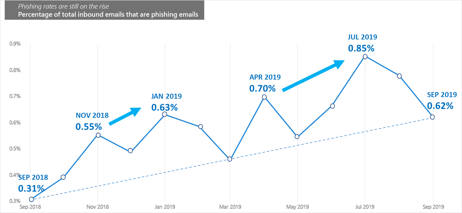 Figure 1. Percentage of inbound emails associated with phishing on average increased in the past year, according to Microsoft security research (source: Microsoft Security Intelligence Report).