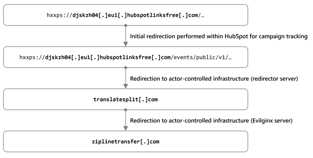 We previously observed Star Blizzard using two different services, HubSpot and MailerLite. The actor used these services to create an email campaign, which provided them with a dedicated subdomain on the service that is then used to create URLs. These URLs acted as the entry point to a redirection chain ending at actor-controlled Evilginx server infrastructure. The services also provided the user with a dedicated email address per configured email campaign, which the threat actor has been seen to use as the “From” address in their campaigns.